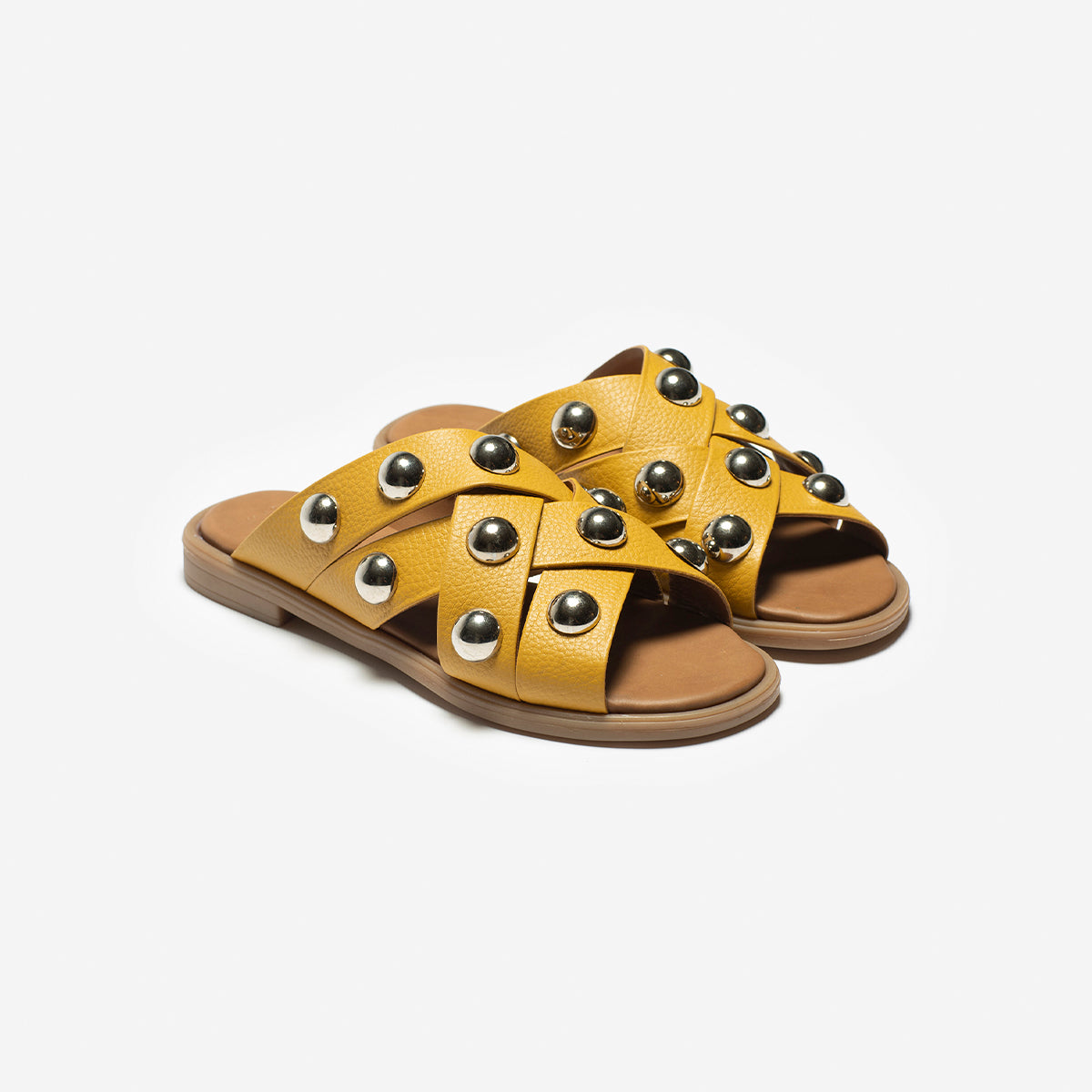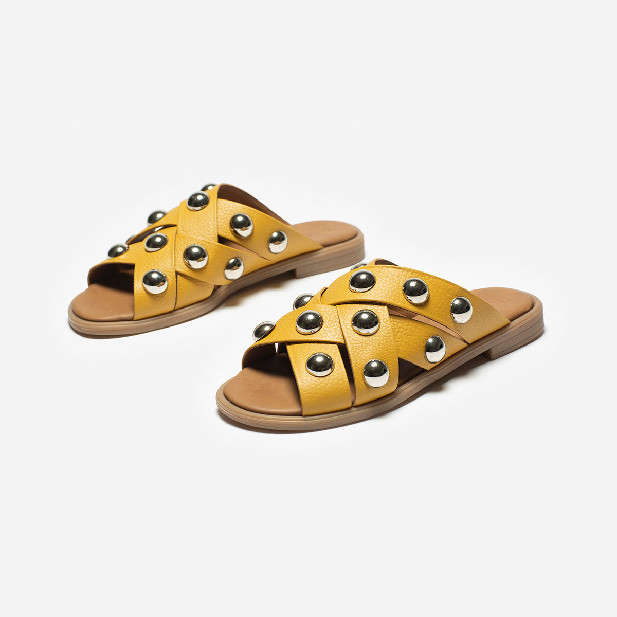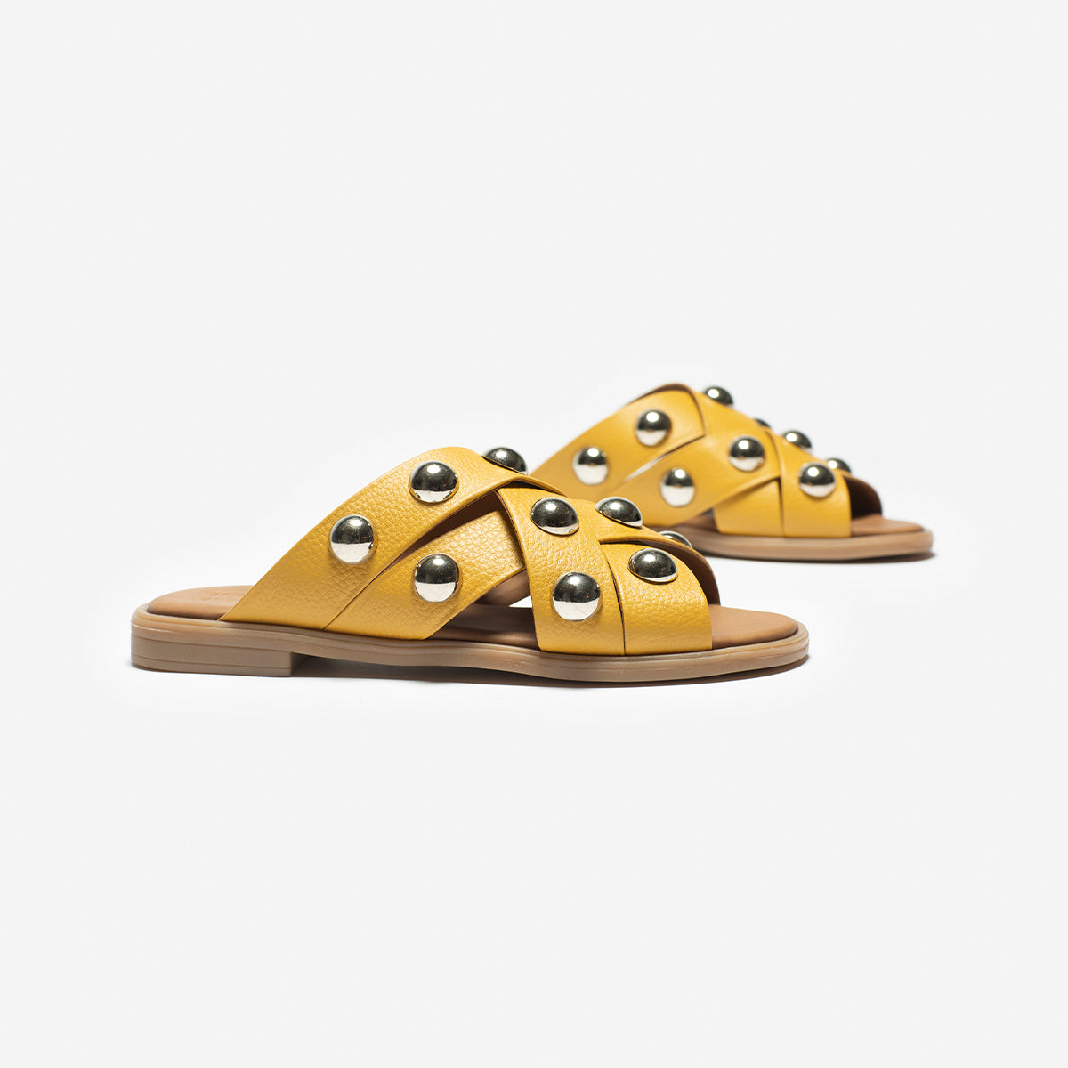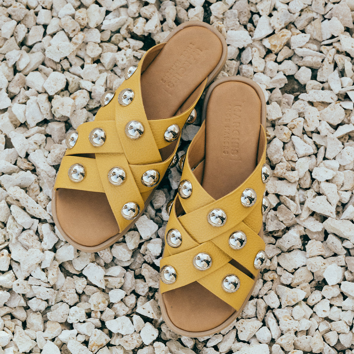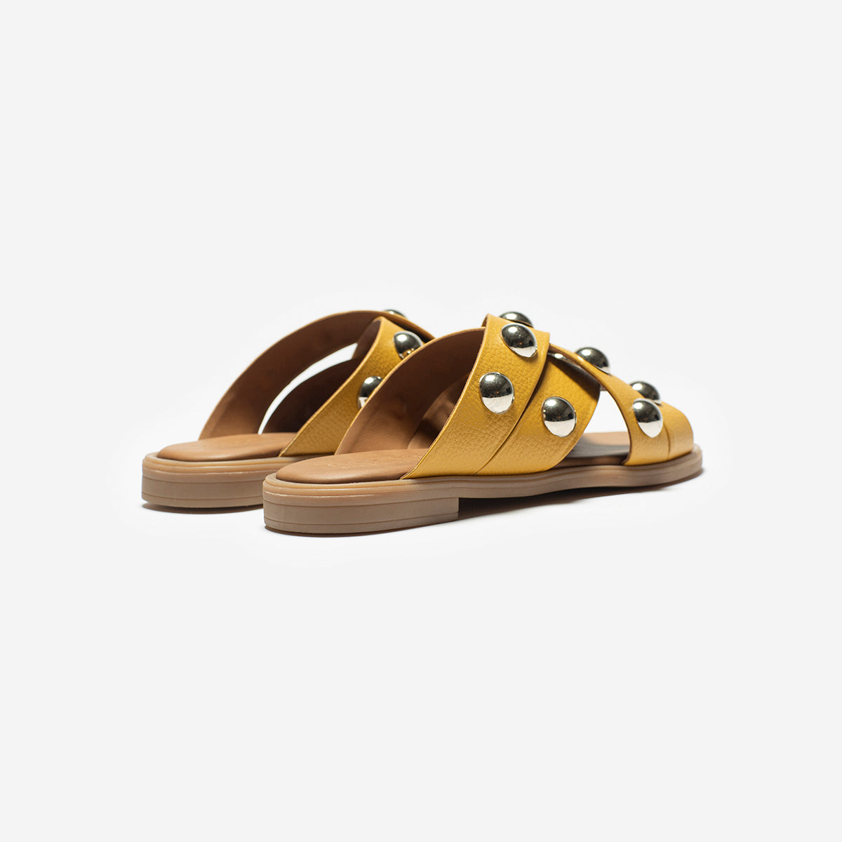 Sandalia Akira Mostaza, base 1 cm, interior y plantilla de cuero.