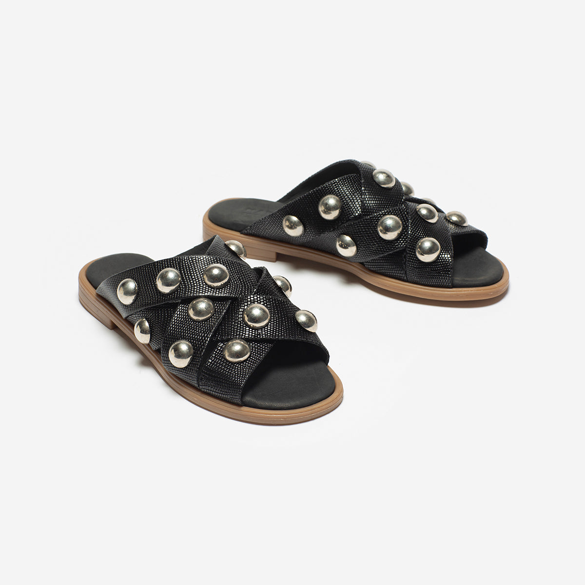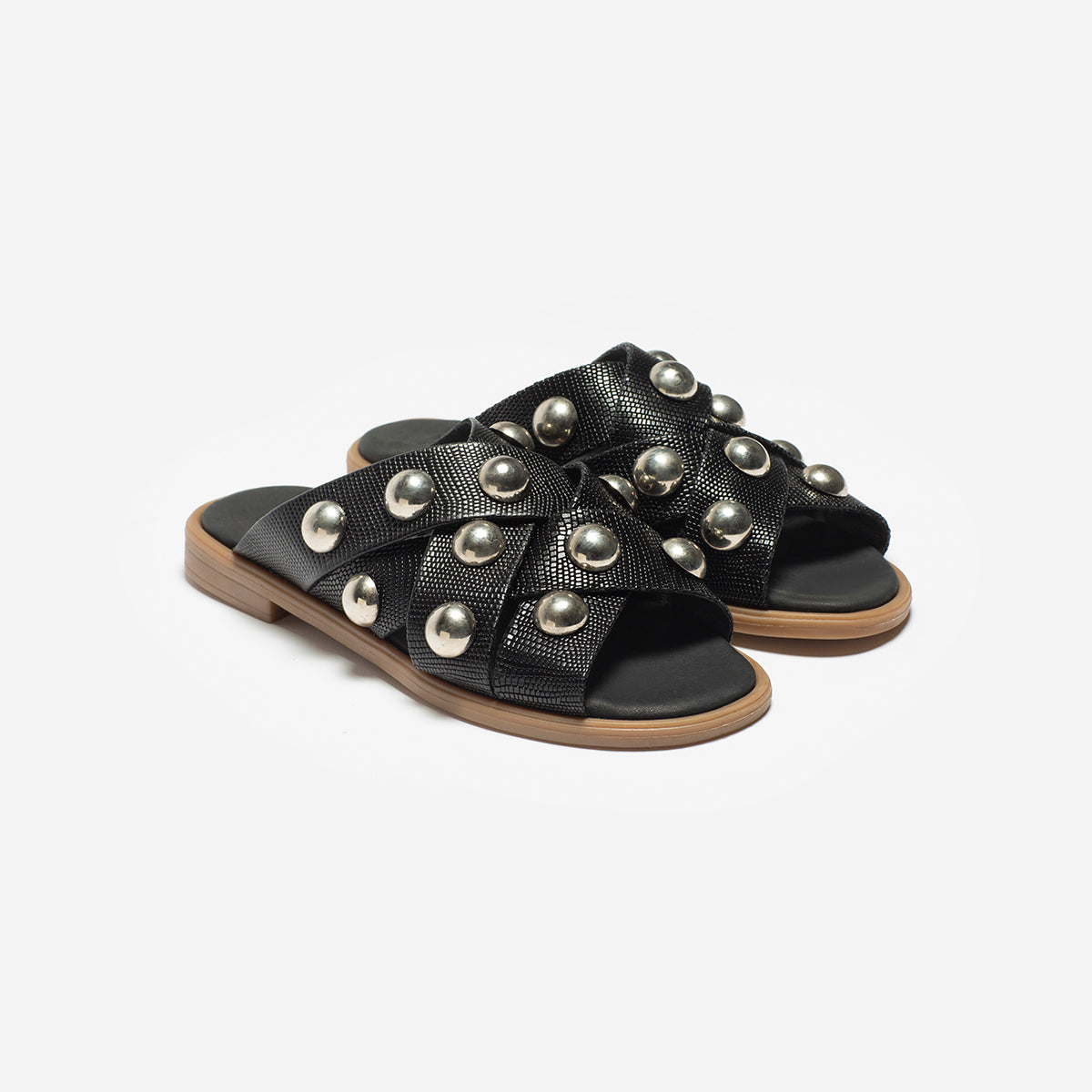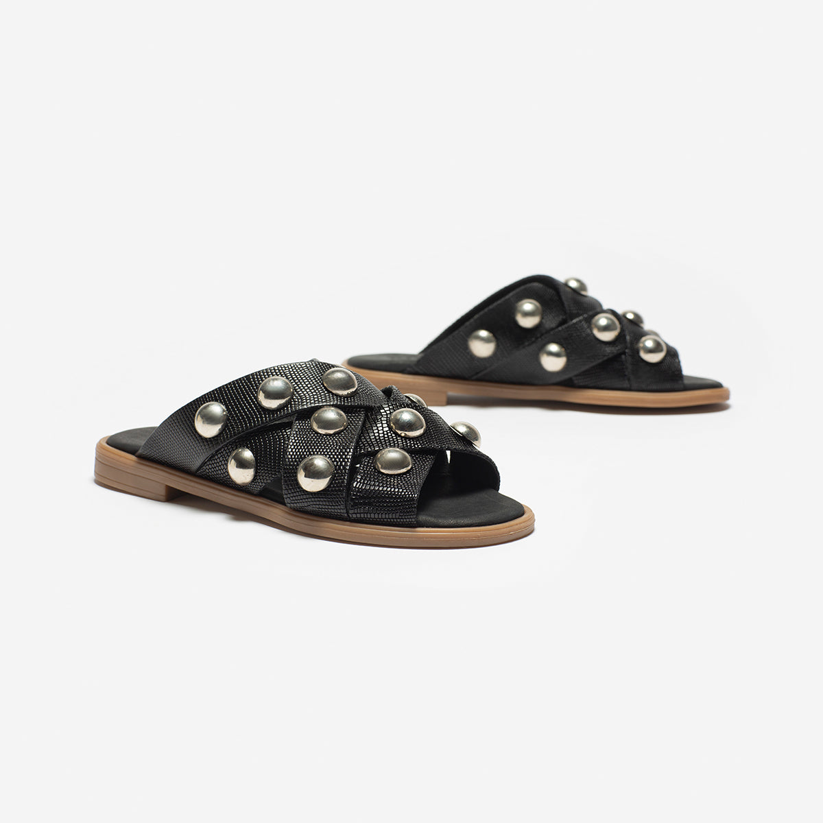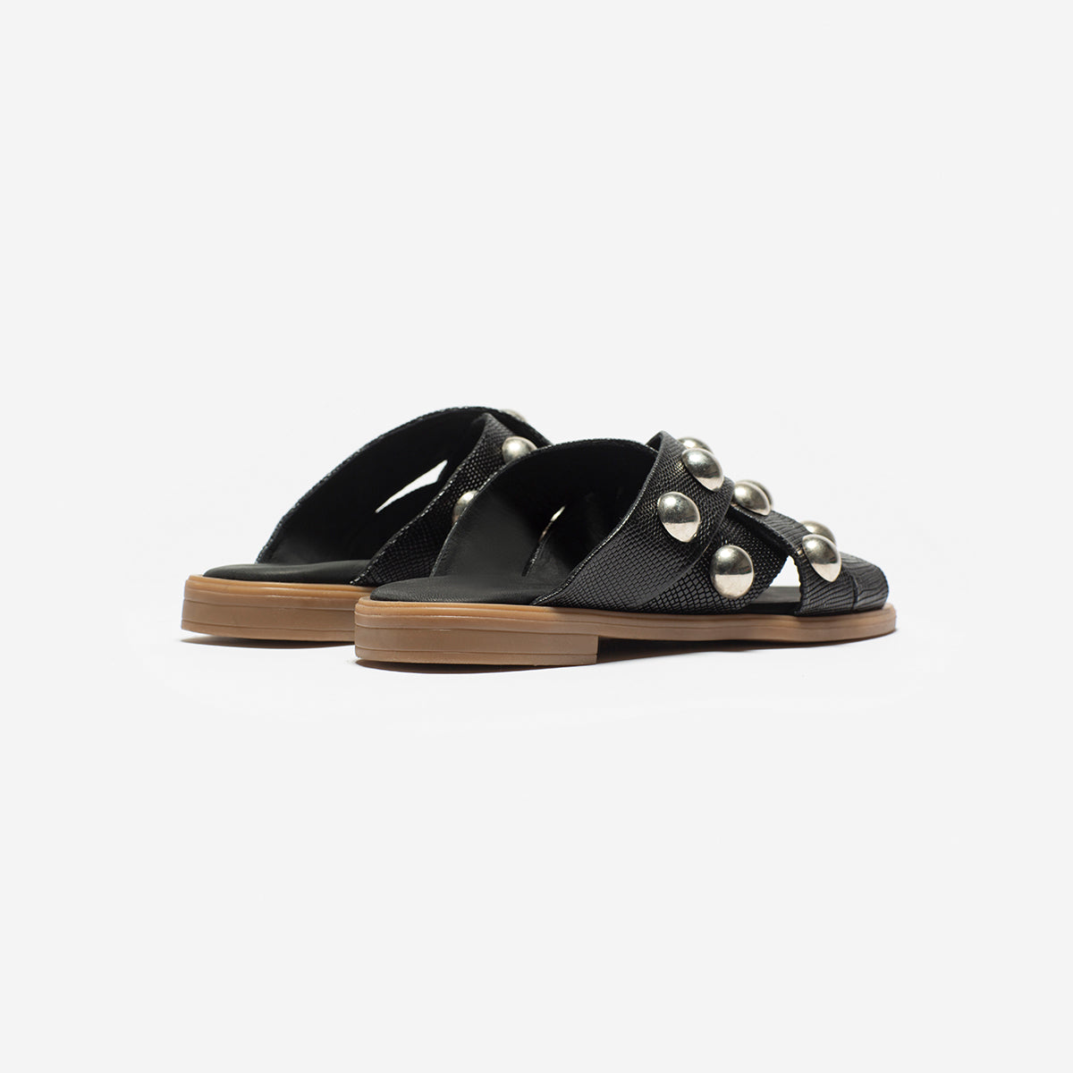 Sandalia Akira All Black, base 1 cm, interior y plantilla de cuero.