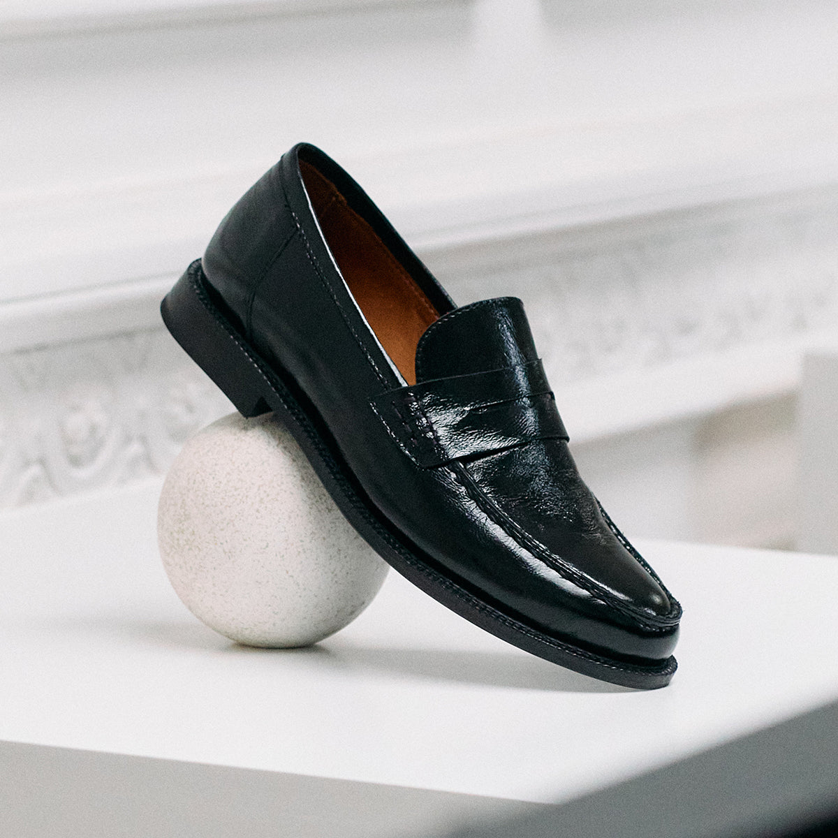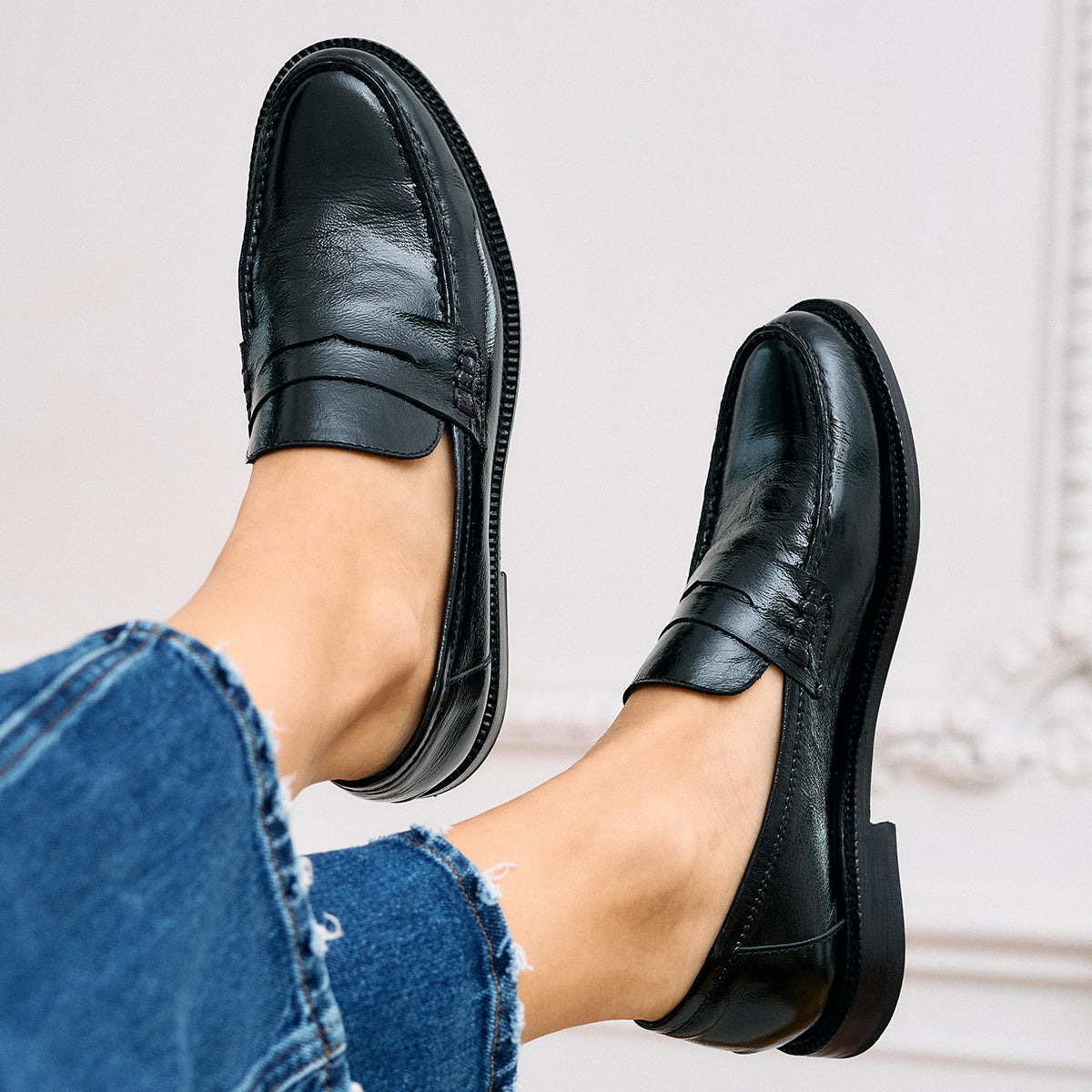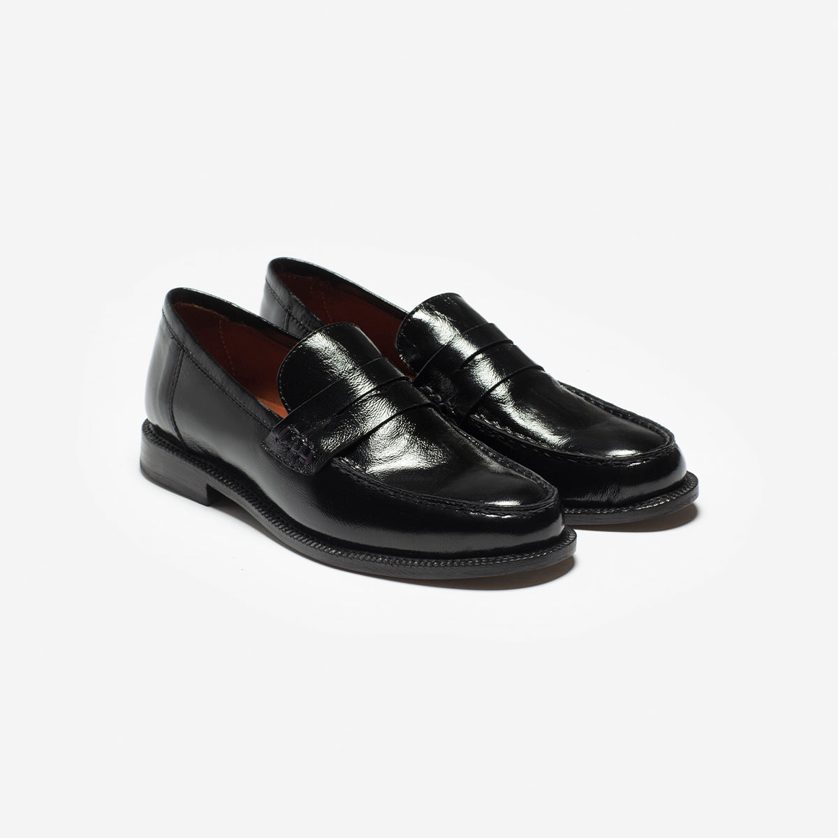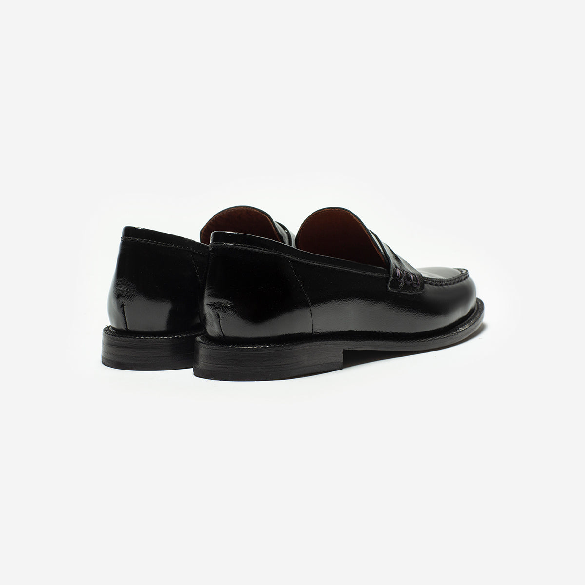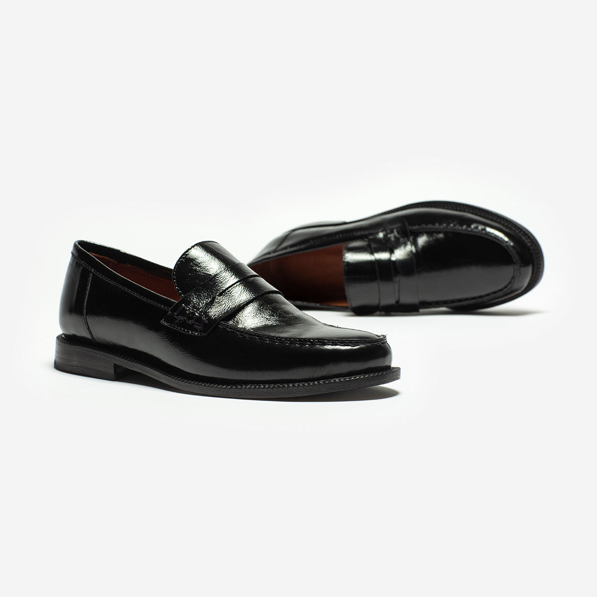 Mocasín Ciro Charol Negro, exterior, interior y plantilla de cuero. Base de 2cm de alto.