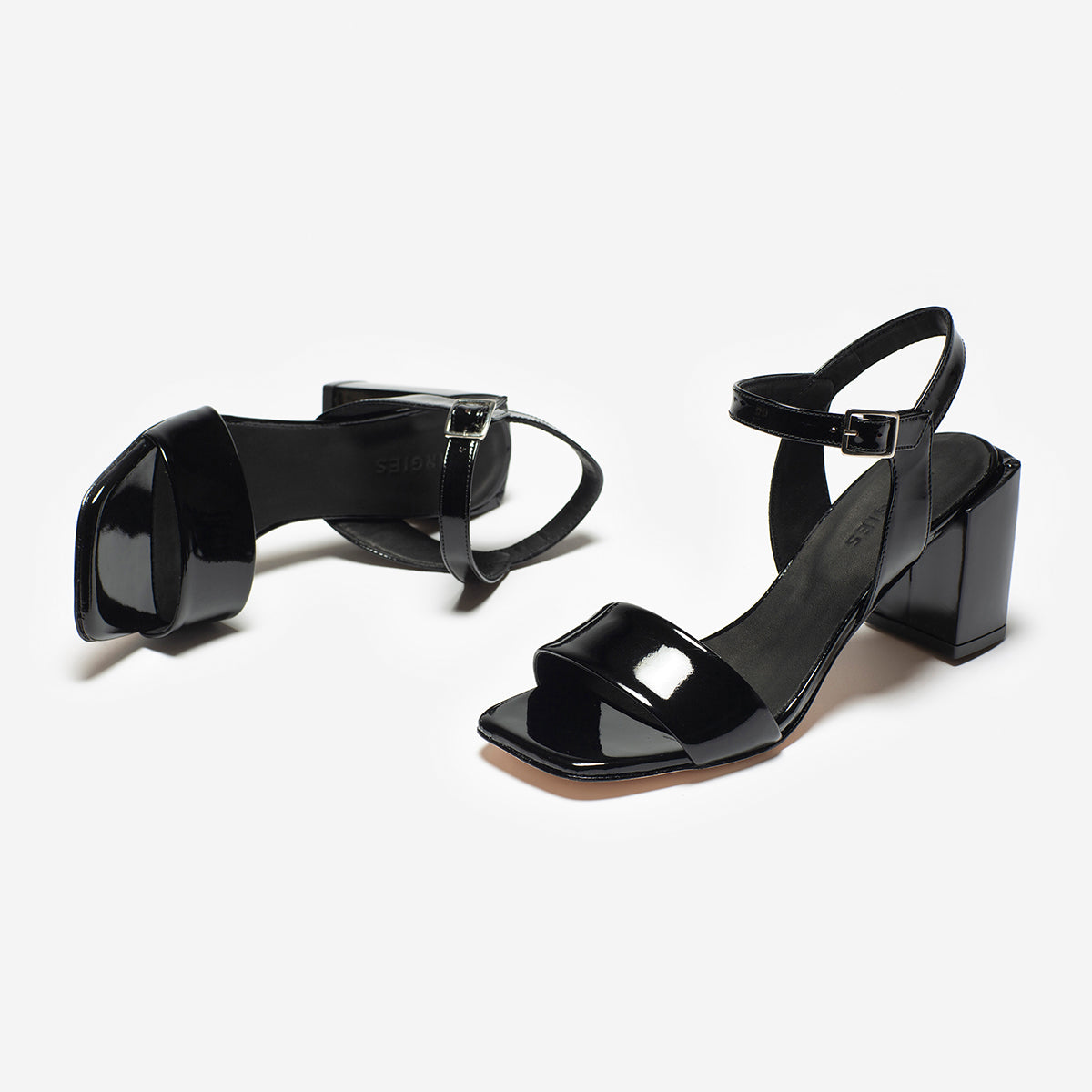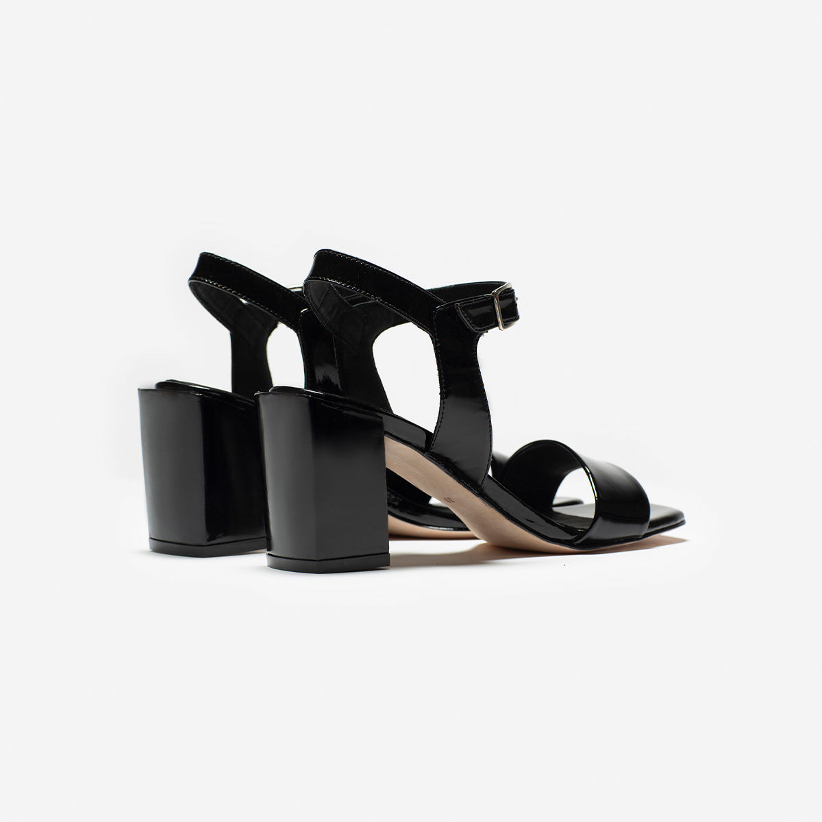 Sandalia Cambre charol negro, interior y plantilla de cuero, taco de 8 cm.
