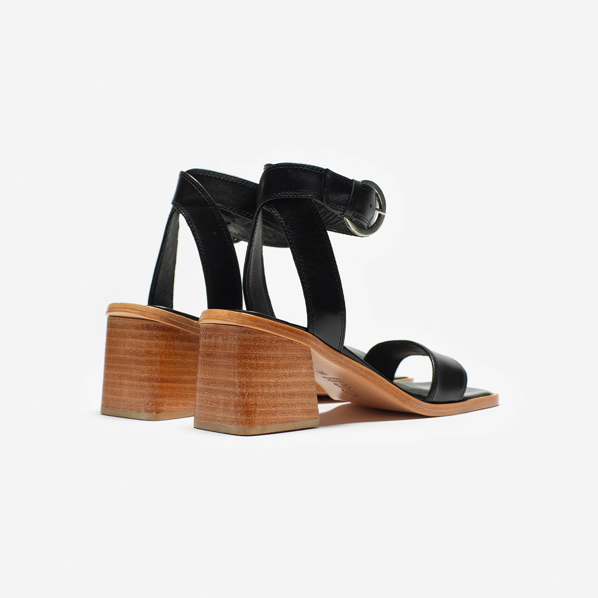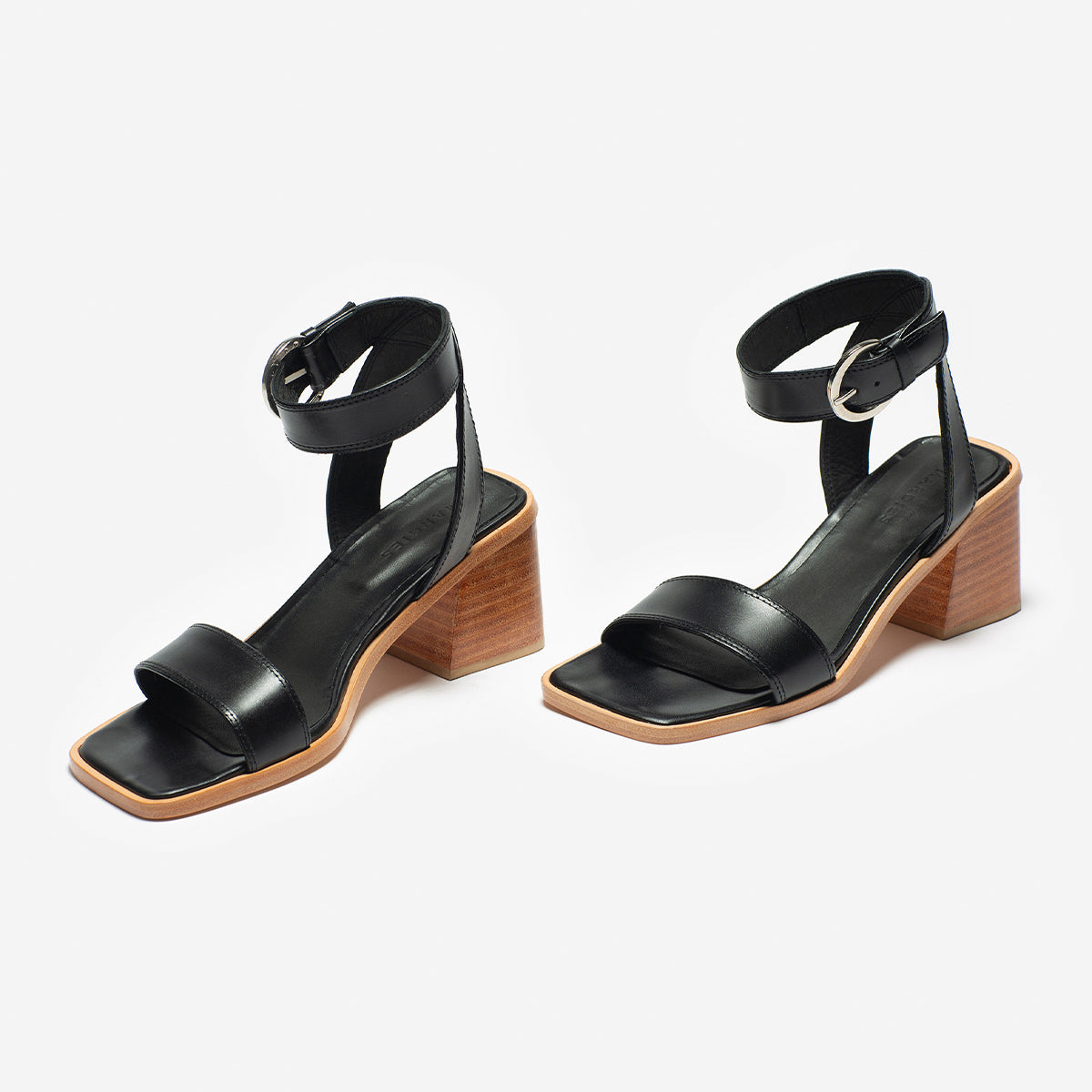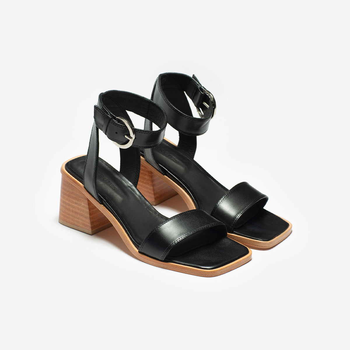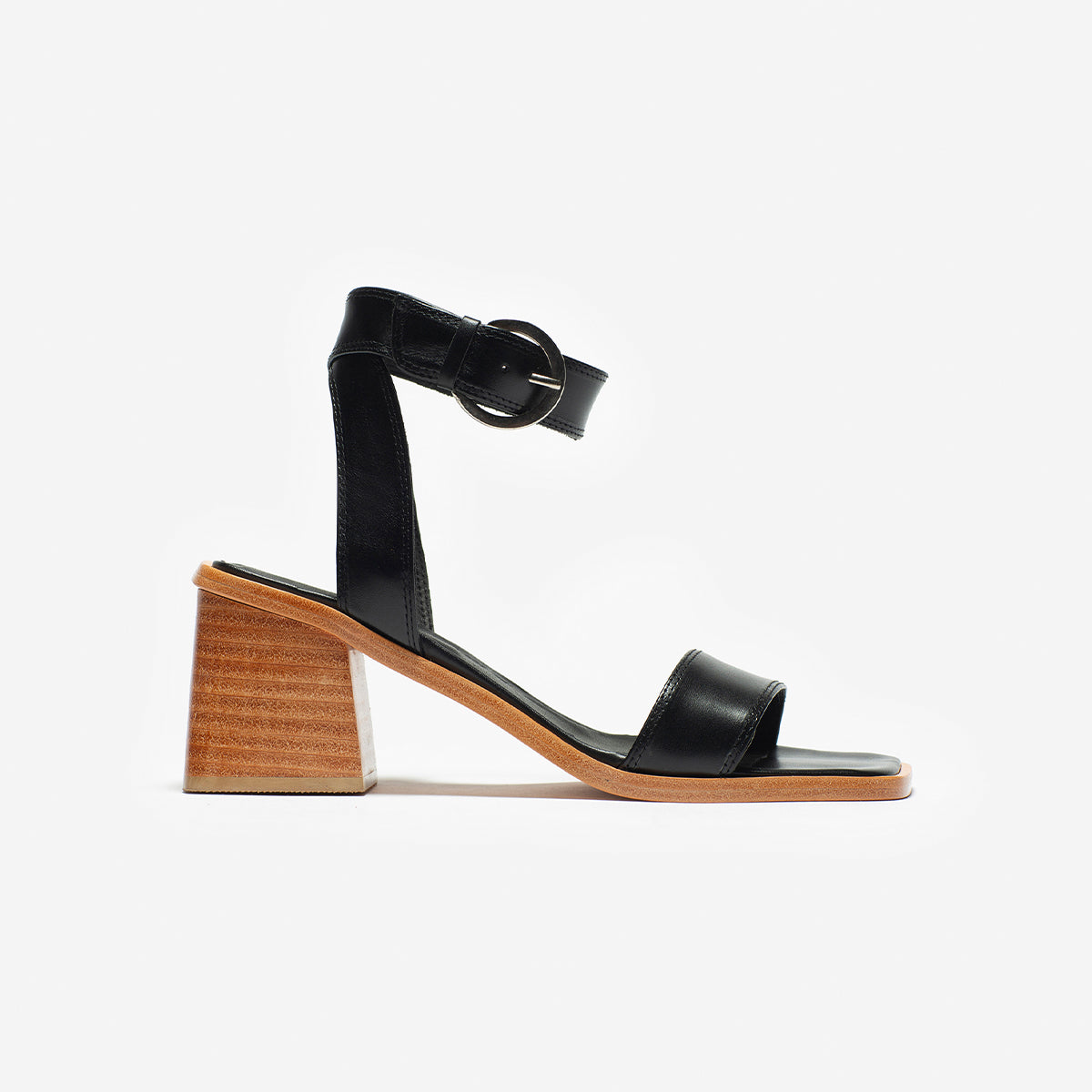 Sandalia Cascais cuero negro, interior y plantilla de cuero, taco de madera de 7cm. Hebilla plateada