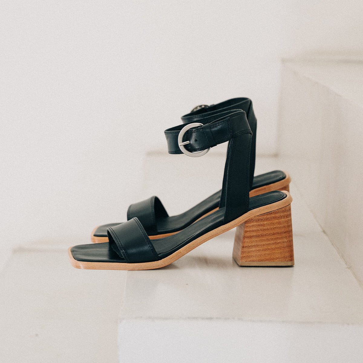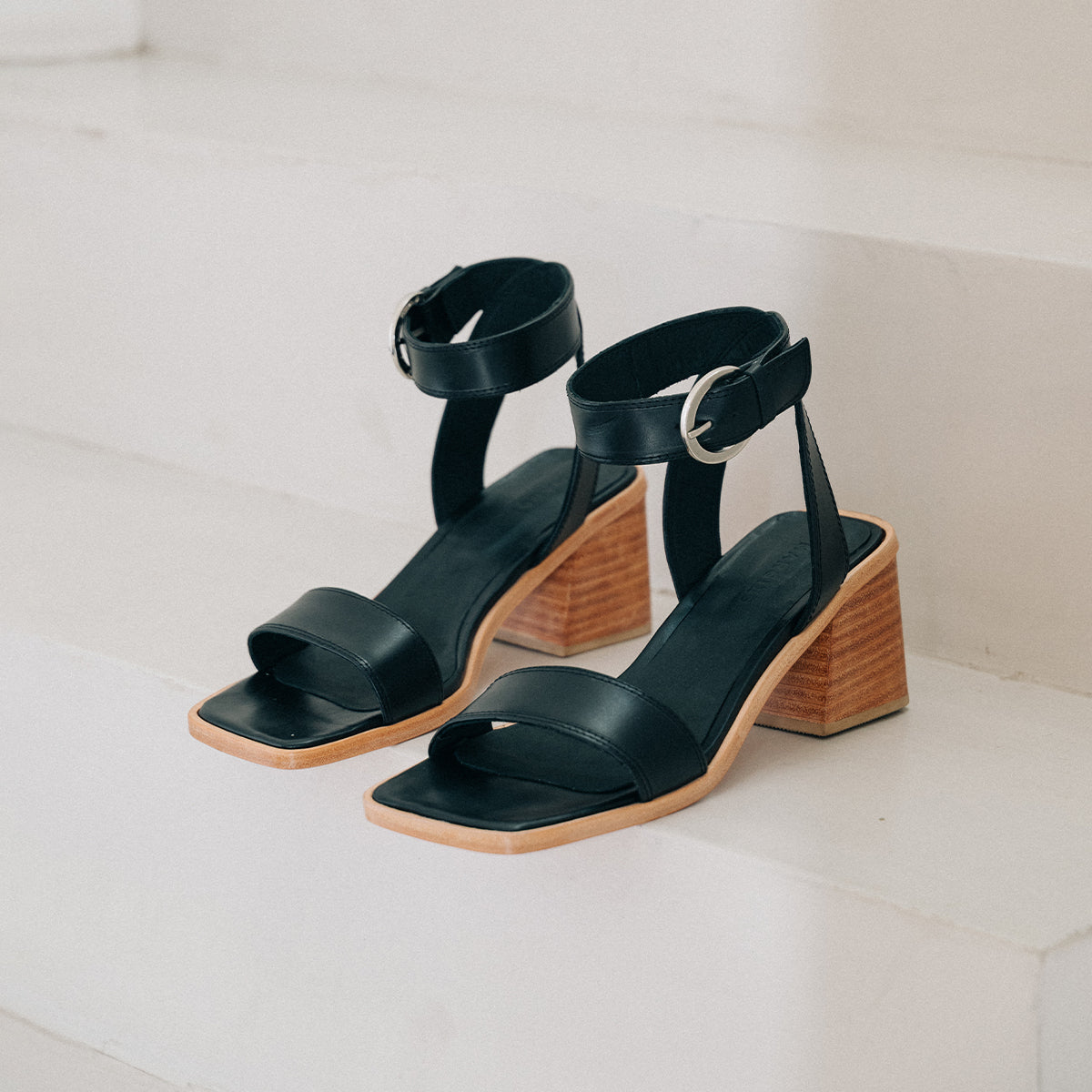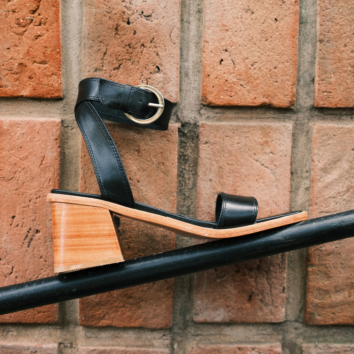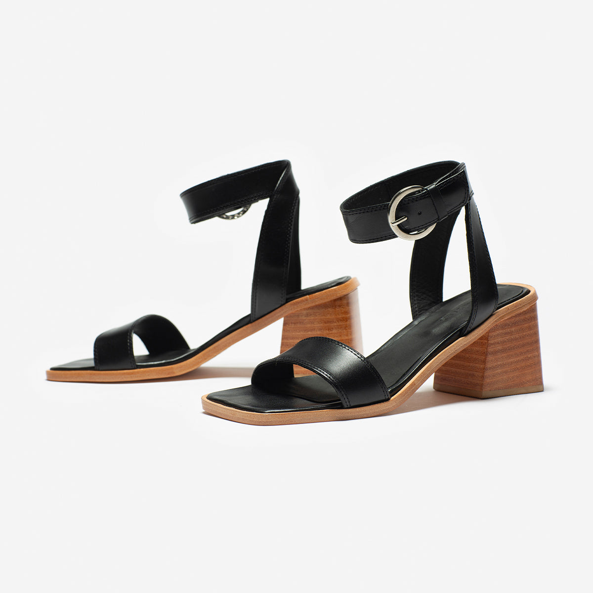 Sandalia Cascais cuero negro, interior y plantilla de cuero, taco de madera de 7cm. Hebilla plateada