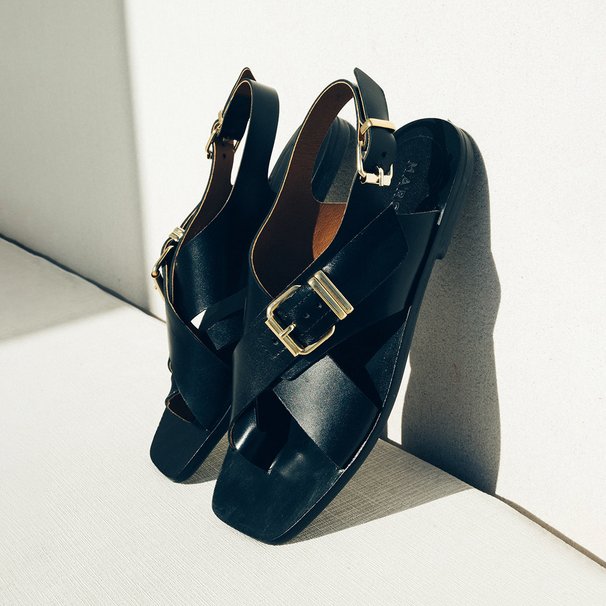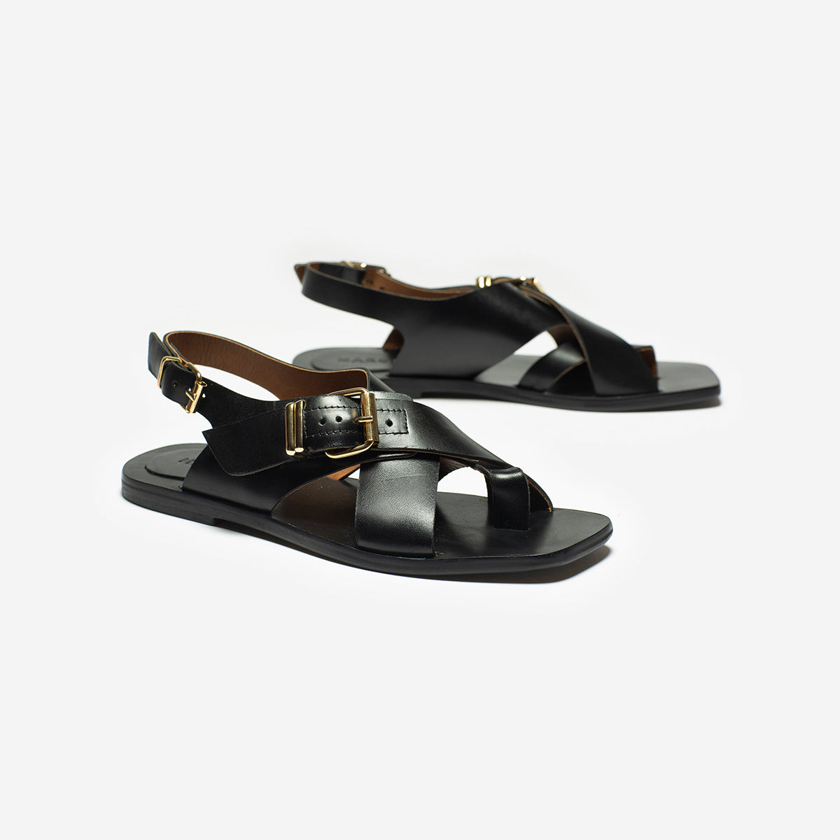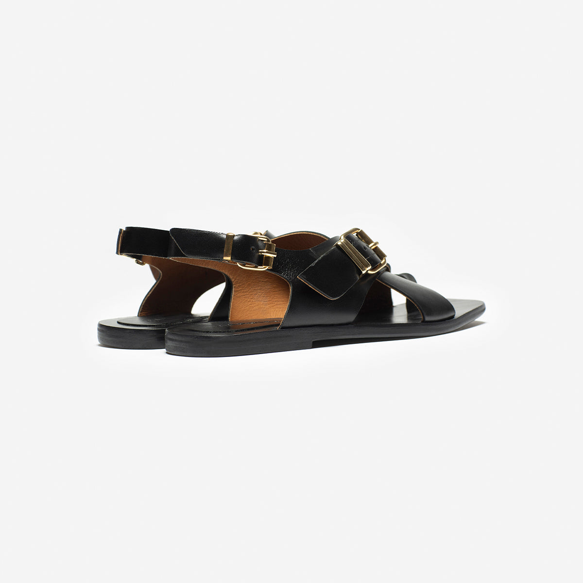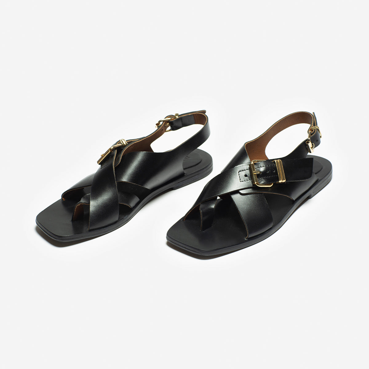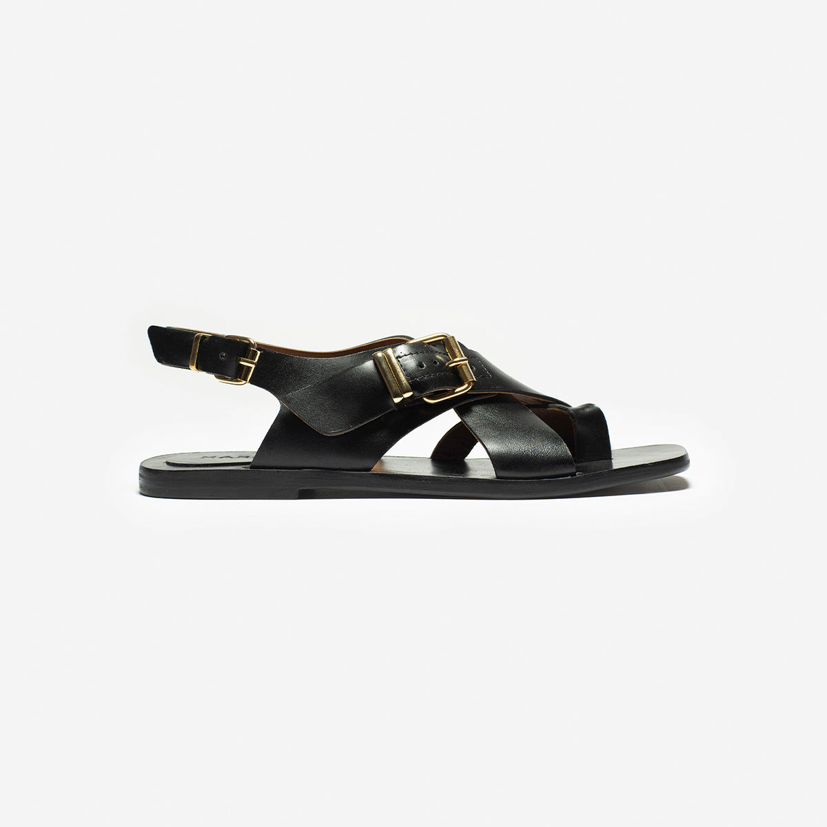 Sandalia Leira Negro, Base de 1 cm, interior y plantilla de cuero. Hebillas doradas.